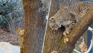 Cleveres Eichhörnchen führt Rotluchs an der Nase herum